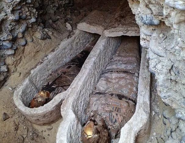 وأسفرت أعمال الحفائر عن الكشف عن عدد من المومياوات التي تعود للعصر الروماني، بعضها ملفوف بلفائف مزخرفة بزخارف هندسية، إلى جانب توابيت خشبية، وثلاثة ألسنة ذهبية وآخر من النحاس، فضلًا عن وجود دلائل على استخدام رقائق الذهب على بعض المومياوات.