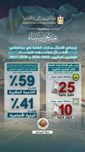 وشدد وزير التخطيط والتنمية الاقتصادية على حرص الدولة، بقيادة السيد الرئيس عبد الفتاح السيسي، على توسيع نطاق التنمية الشاملة، وزيادة الاستثمار في رأس المال البشري لتصبح عملية التنمية هى الدرع الحقيقي للحفاظ على الأرض. ونوه بأن 59% من الاستثمارات الموجهة للمحافظتين تركز على “التنمية البشرية”، مقابل 41% موجهة لمشروعات البنية الأساسية.