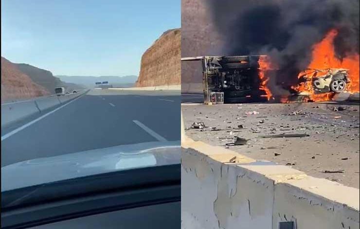وتوصلت التحقيقات فيه -حتى تاريخِهِ- إلى محاولة قائد السيارة النقل تفادي تصادمه بالسيارة الملاكي التي فُوجِئ بتوجهها نحوه في الاتجاه المعاكس بسرعة فائقة، ولكنه لم يُفلح واصطدمت به السيارة، مِمَّا أدى لتفحمها بالكامل وتفحم جثمان قائدتها، واندلاع حريق بكابينة السيارة النقل وإطاراتها وإصابة قائدها، وكسرٍ بالحاجز الخرساني بالطريق.