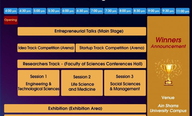 حيث يعرض المتسابقون أفكارهم الابتكارية في إطار تنافسي عبر شبكة الإنترنت ، في حين يتضمن اليوم الثاني عدداً من المحاضرات فى مختلف المجالات ، وذلك بدءاً من الرابعة عصراً بحرم قصر الزعفران جامعة عين شمس.