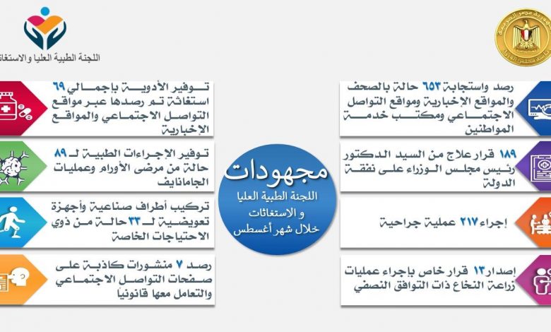 وأوضح المستشار الطبي لرئاسة مجلس الوزراء، أن الاستجابات خلال شهر أغسطس شملت صدور 189 قرار علاج من رئيس الوزراء على نفقة الدولة، للفئات الأكثر احتياجاً، فضلاً عن إجراء 217 عملية جراحية، وإصدار 13 قراراً خاصا بإجراء عمليات زراعة النخاع ذات التوافق النصفي.