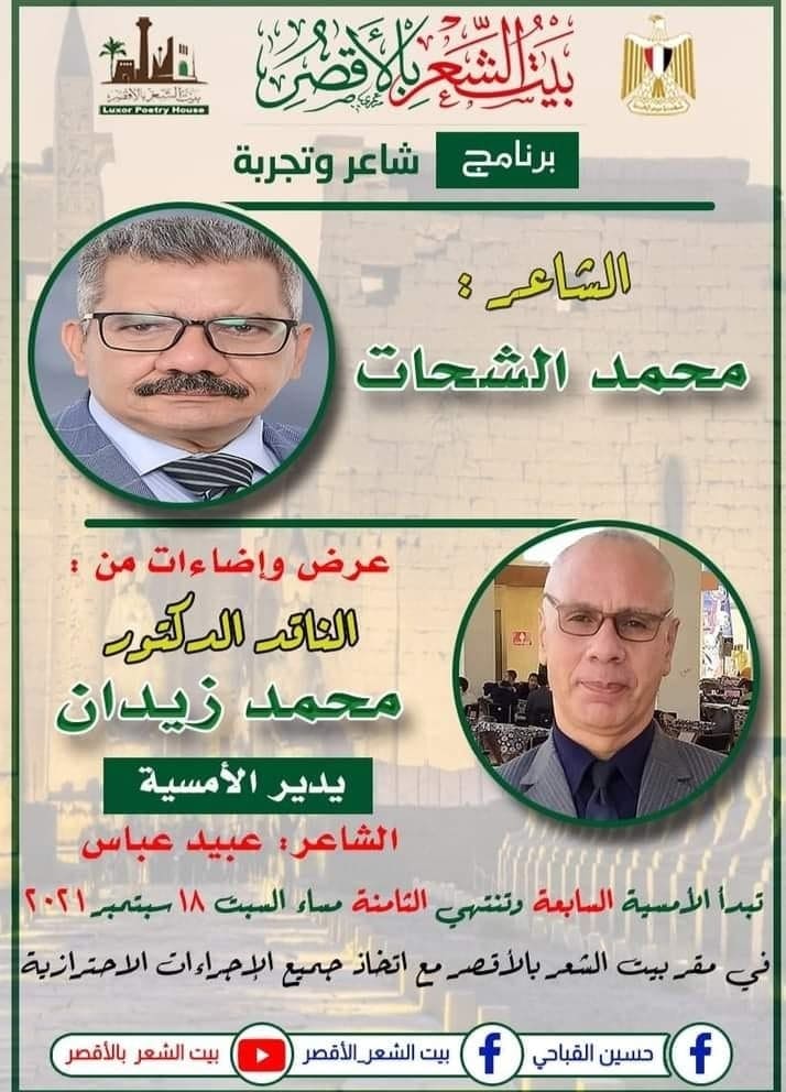 تسهر الليلة السبت 18 سبتمبر الاثار الفرعونية بمدينه طيبه مع تجربة الشاعر محمد الشحات ببيت الشعر بالاقصر ضمن برنامجه (شاعر وتجربة) وايضا الى ما سوف يقوله الناقدوالشاعر الدكتور محمد زيدان ، عن تجربة الشحات الشعرية التى تقترب من النصف قرن ومنذ إصداره لديوانه الأول الدوران حول الرأس الفارغ عام 1974 ، وقد تصادف عقد تلك الندوة مع صدور اعماله الكاملة هذا الاسبوع والتى تقع فى أربعة أجزاء يضم عشرون ديوانا صدرت عن دار الأدهم .