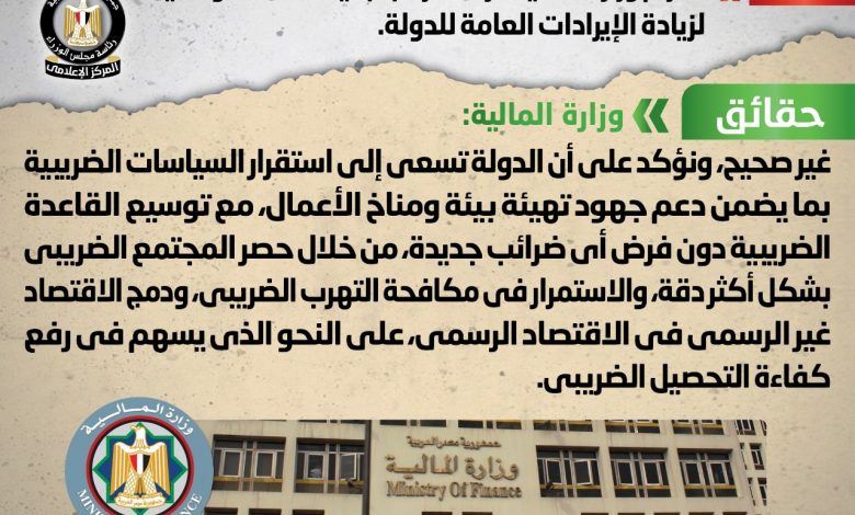 كشف المركز الإعلامي لمجلس الوزراء إنه فى ضوء ما تردد من أنباء بشأن اعتزام وزارة المالية فرض ضرائب جديدة على المواطنين لزيادة الإيرادات العامة للدولة، تواصل المركز مع وزارة المالية، والتي نفت تلك الأنباء، مُؤكدةً أنه لا صحة لفرض ضرائب جديدة على المواطنين لزيادة الإيرادات العامة للدولة.