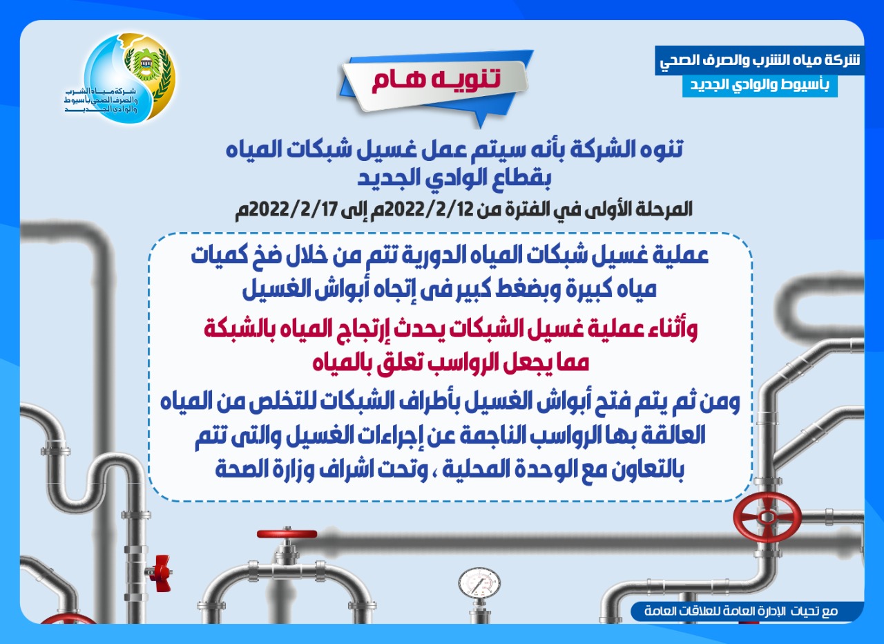 و تنوه الشركة على المواطنين أنه فى حالة وجود أى رواسب عالقة بالمياه خلال الأوقات القليلة القادمة بعد إجراء أعمال غسيل الشبكات، يتم تشغيل المياه بعض الوقت للتخلص من تلك الرواسب .