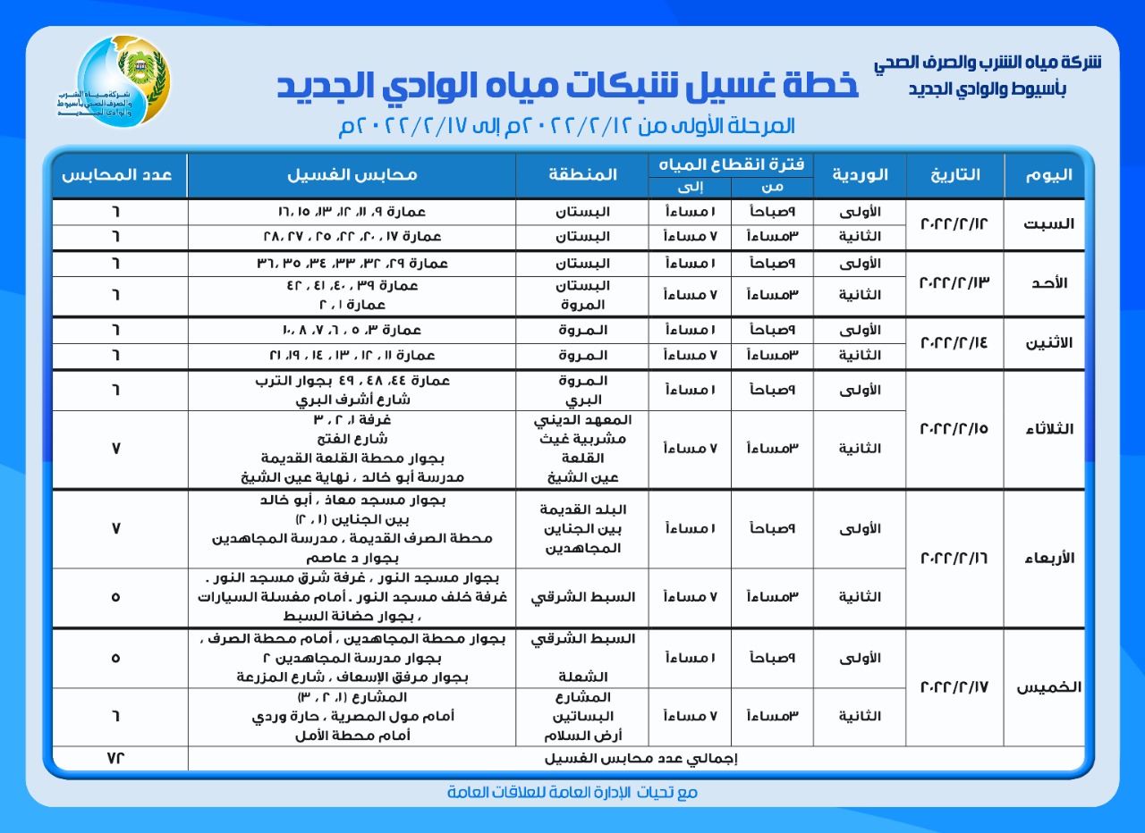 أعلنت شركة مياه الشرب والصرف الصحي بأسيوط والوادي الجديد عن بدء خطة أعمال غسيل شبكات مياه الشرب بمدينة الخارجة بمحافظة الوادي الجديد خلال شهر فبراير الحالى كمرحلة أولى بالتنسيق الكامل بين الإدارات المعنية بجودة المياه وشئون البيئة، مع التأكيد بالالتزام بالجدول الزمنى المحدد والمواعيد المقررة لأعمال الغسيل والتطهير، وضمانا لجودة المياه المقدمة للمواطنين باعتبارها على رأس اهتمامات الشركة.