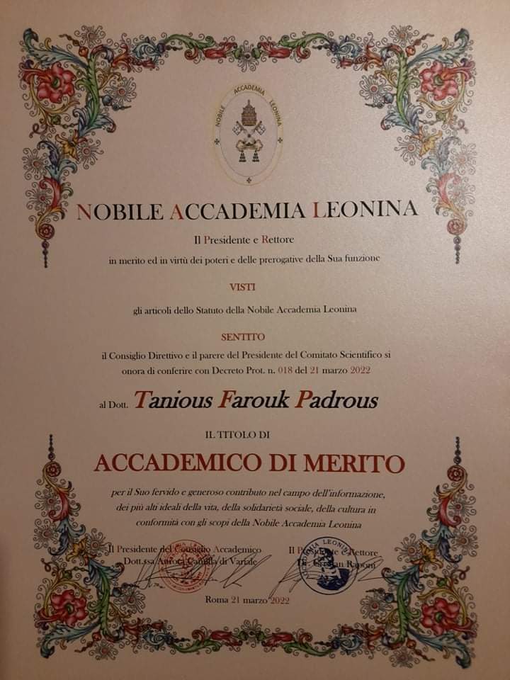 ناقشت أكاديمية Nobile Accademia Leonina بالعاصمة الايطالية روما ، رسالة دبلومة متقدمه مقدمة من الكاتب الصحفي طانيوس تمري فاروق عضو الجمعية العمومية لنقابةالصحفيين ، بعنوان ( الهندسة الرقميه في الصحافة والاعلام ودراسة ميدانية على القائمين في العديدمن الدول “، وذلك بحضور الدكتور كرستيان رابوني رئيس الاكاديميه وممثل عن دولة الفاتيكان واعضاء اللجنة العامة .