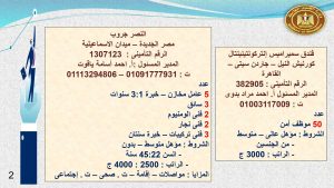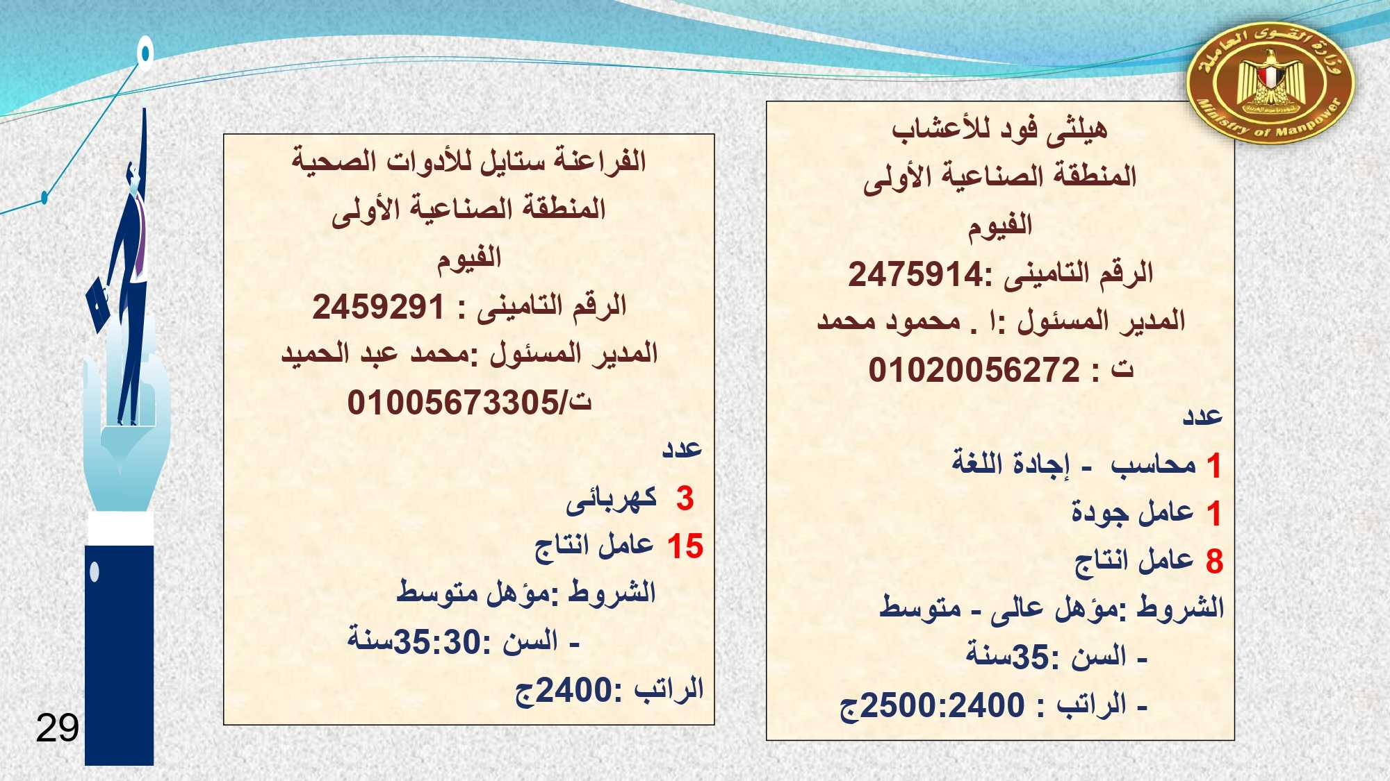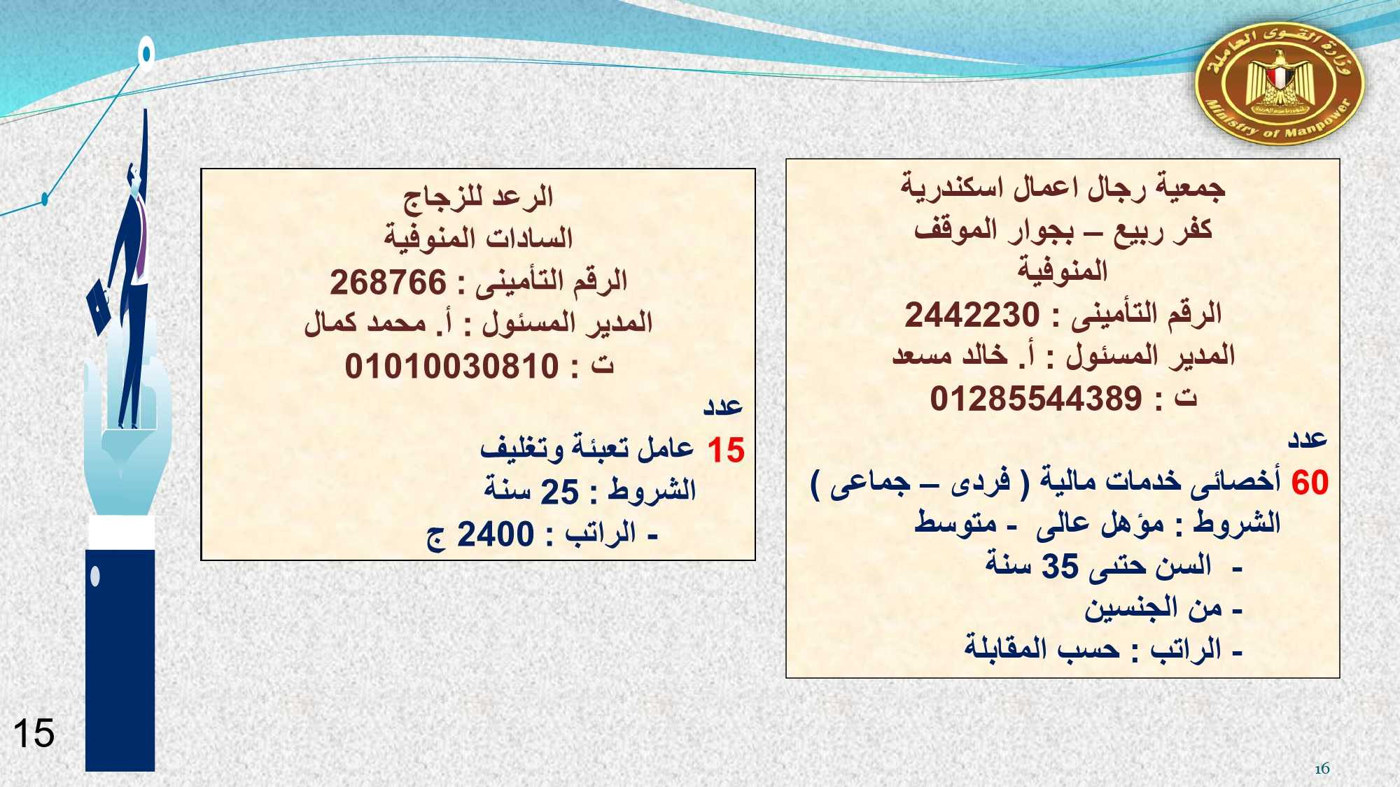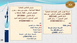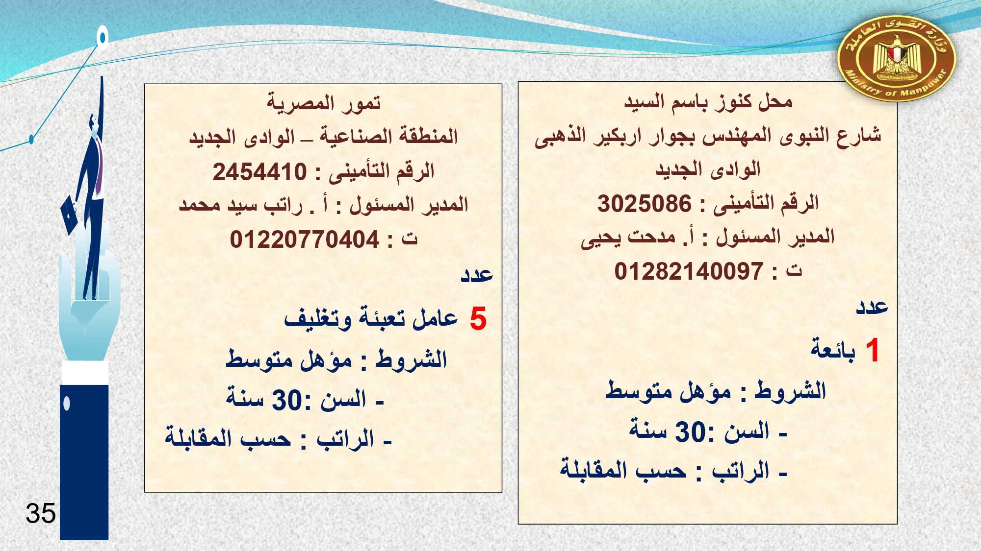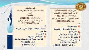 وفى الوادى الجديد والفيوم وقنا مطلوب :محاسب ، و بائعة ، و 23 عامل إنتاج ، و 2 مساعد إدارى ، و 5 عامل تعبئة وتغليف ، و3 كهربائى ، و 7 عامل ، وفرد أمن ، وعامل سيرفيس .