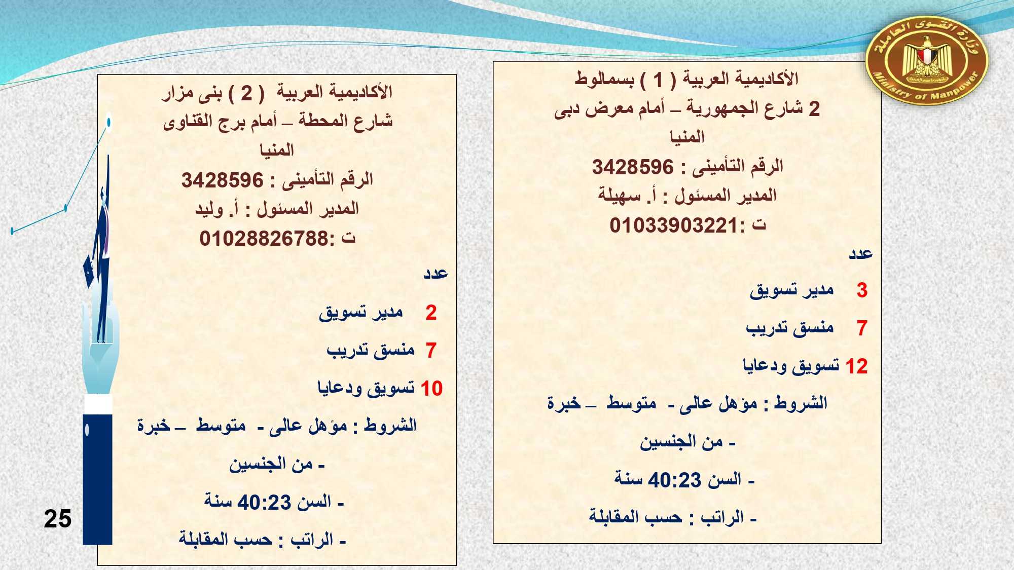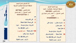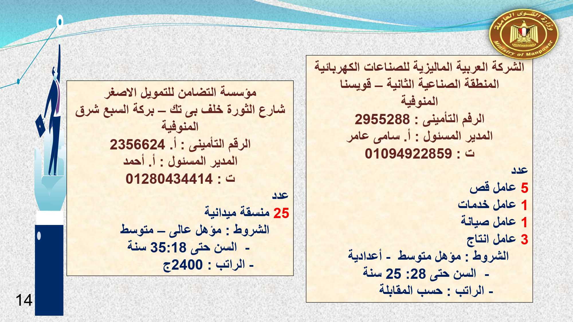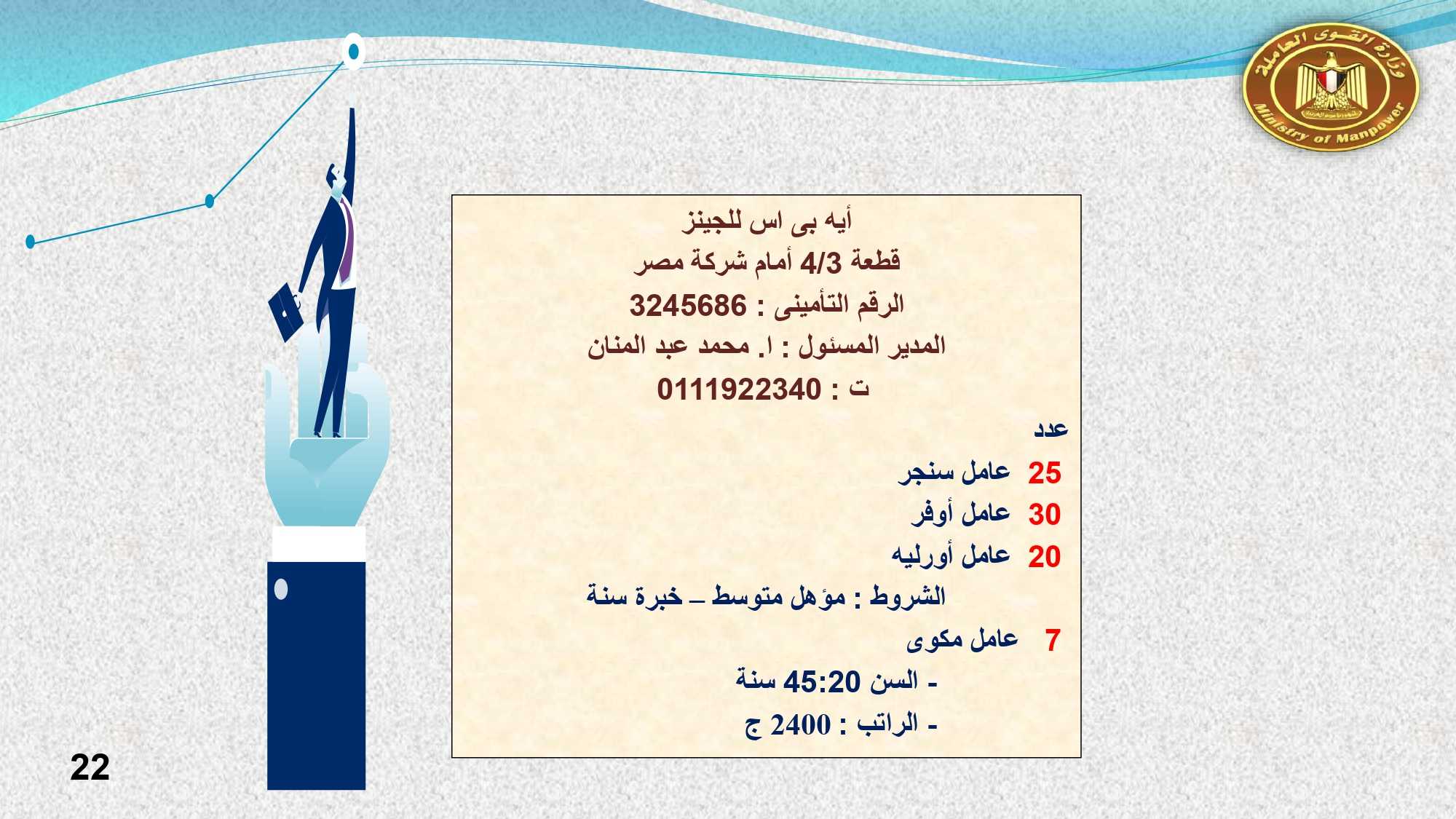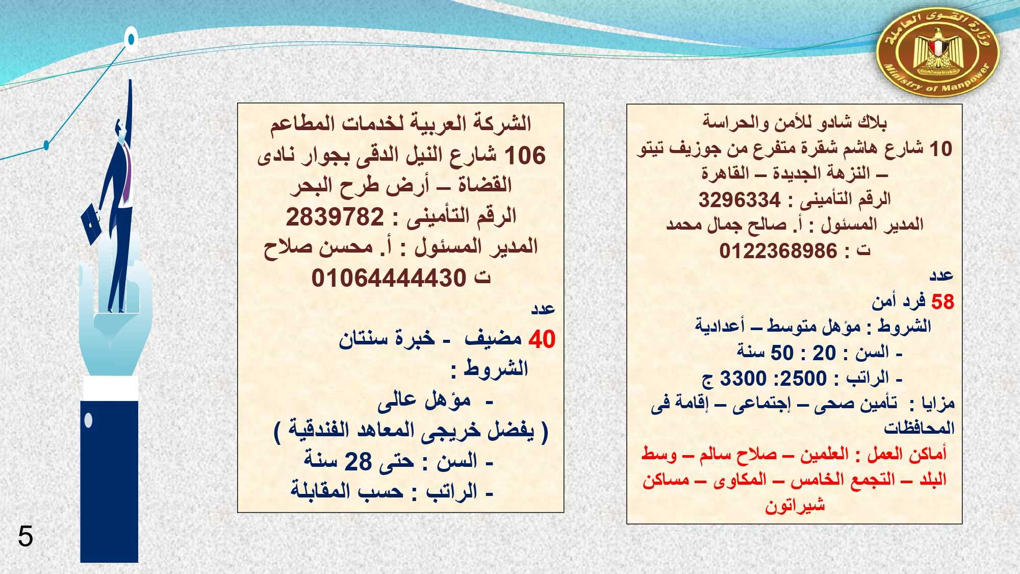 وفى الوادى الجديد والفيوم وقنا مطلوب :محاسب ، و بائعة ، و 23 عامل إنتاج ، و 2 مساعد إدارى ، و 5 عامل تعبئة وتغليف ، و3 كهربائى ، و 7 عامل ، وفرد أمن ، وعامل سيرفيس .