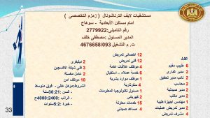 أما سوهاج فقد وفرت العديد من الفرص منها: 6 طبيب مقيم ، و 2 مدير إدارى ، و 2 نائب مدير تحقيق ، و 2 محاسب ، و 2 مدير صيدلية ، و 2 مدير مكتب، و مهندس أجهزة طبية ، و 2 مدير تمريض عمليات ، و4 مشرف تمريض ، و 12 أخصائى تمريض ، و 12 فنى تمريض ، و 4 موظف علاقات عامة ، 6 خدمة عملاء ، و موظف موارد بشرية ، و 4 سكرتارية ، ومسئول تكنولوجيا معلومات ، و 2 كهربائى ، و 15 خدمات معاونة، و 4 مساعد صيدلي، و 3 فنى شبكة أكسجين، و 2 دليفرى ، و 10 موظف أمن ، و 2 عامل مغسلة.