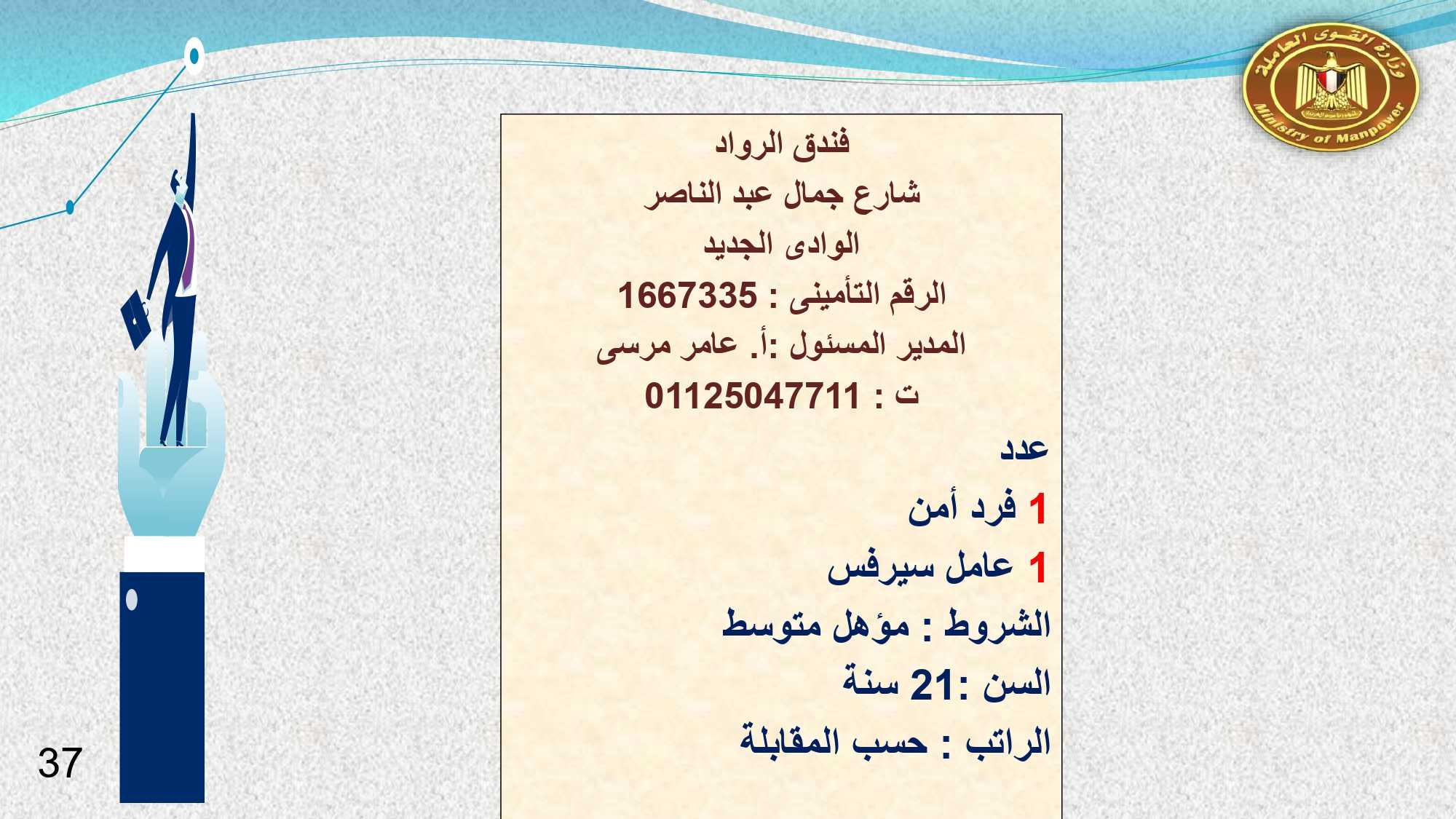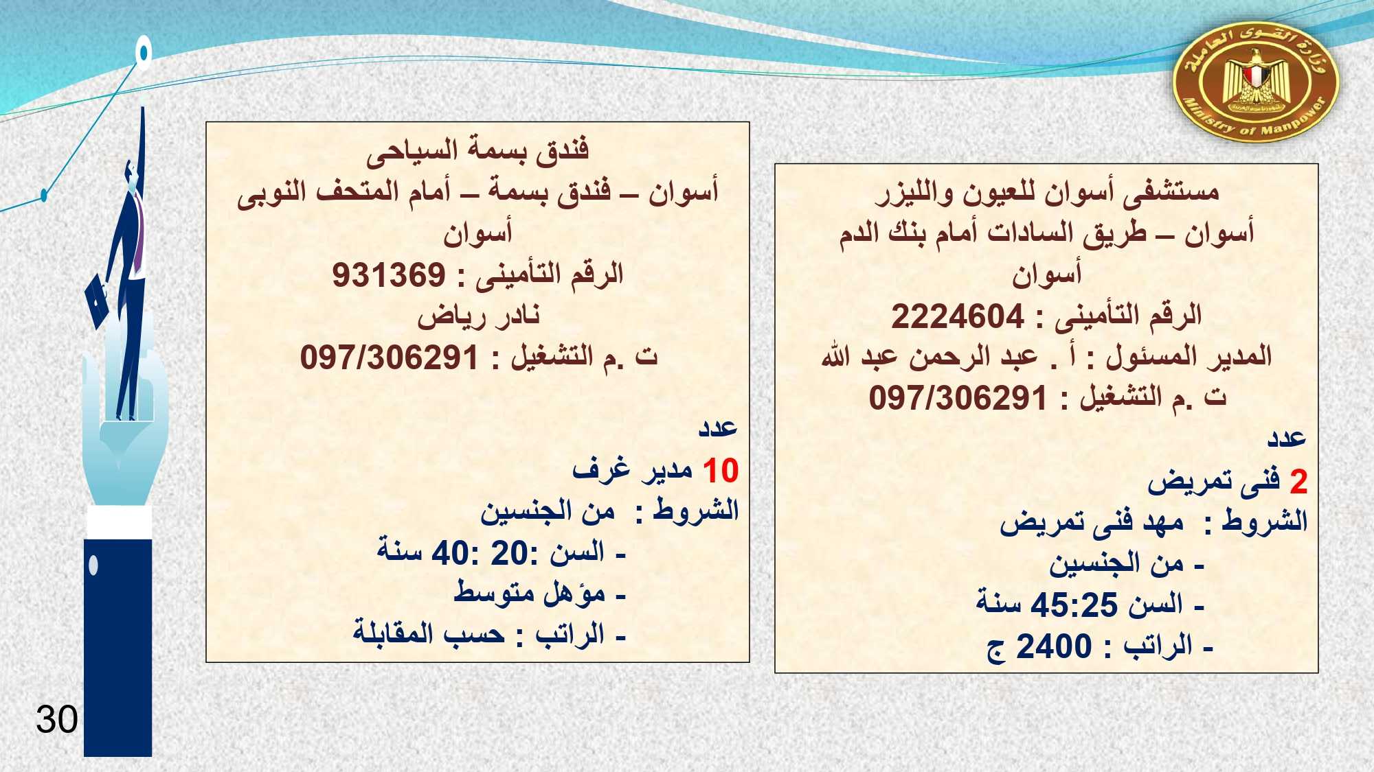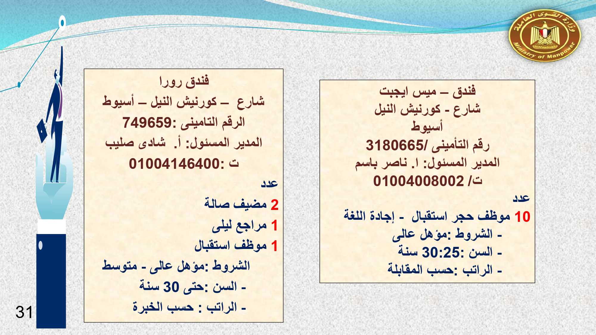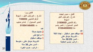 أما فى أسوان وأسيوط الوظائف المتوفرة هى : 13 موظف استقبال وحجز ، و 2 مضيف صالة ، و 4 مراجع ليلى ، و 2 استيور ، و 2 شيف سخن ، و 52 مسئول تأمين ، و 10 مدير غرف ، و2 فنى تمريض .