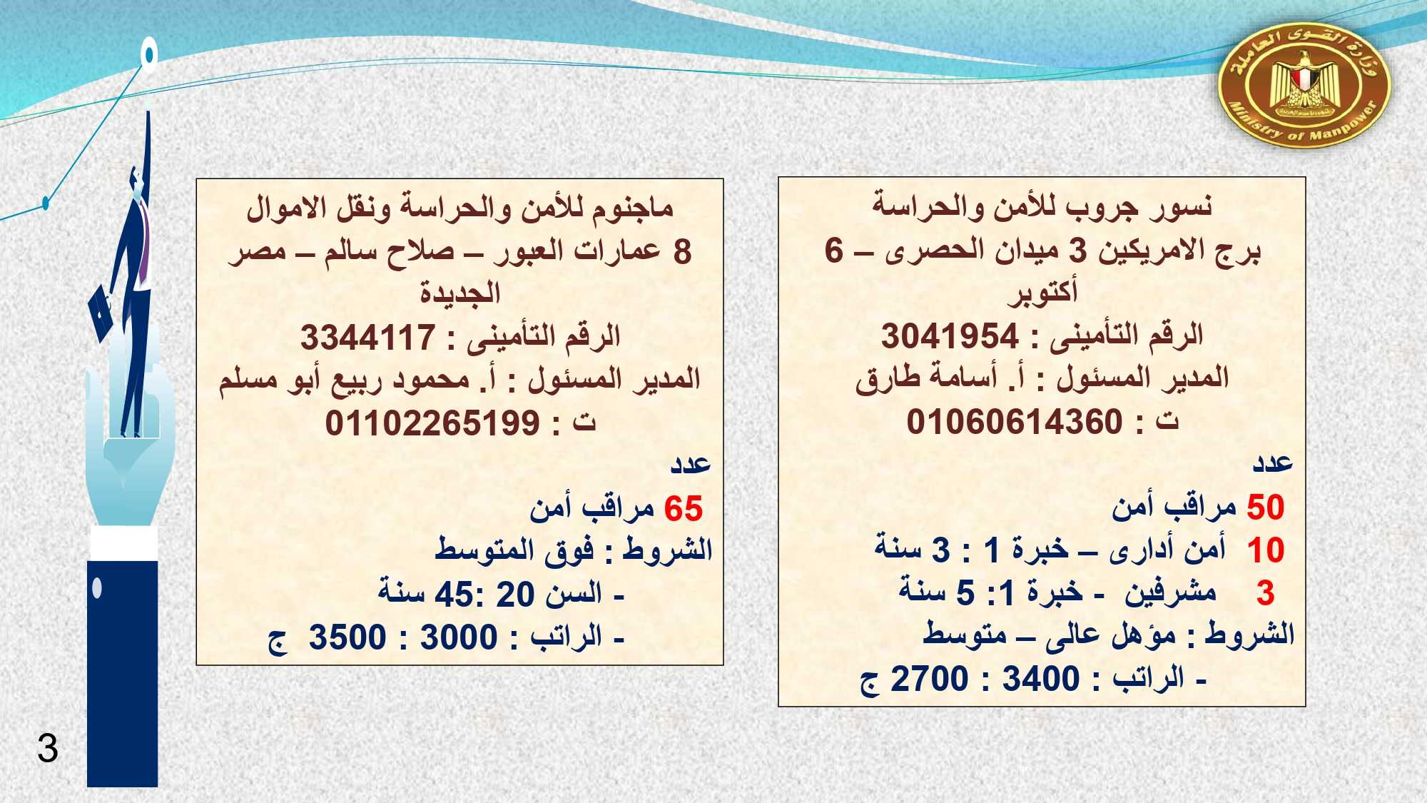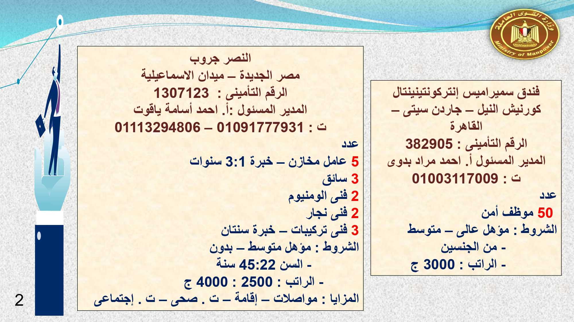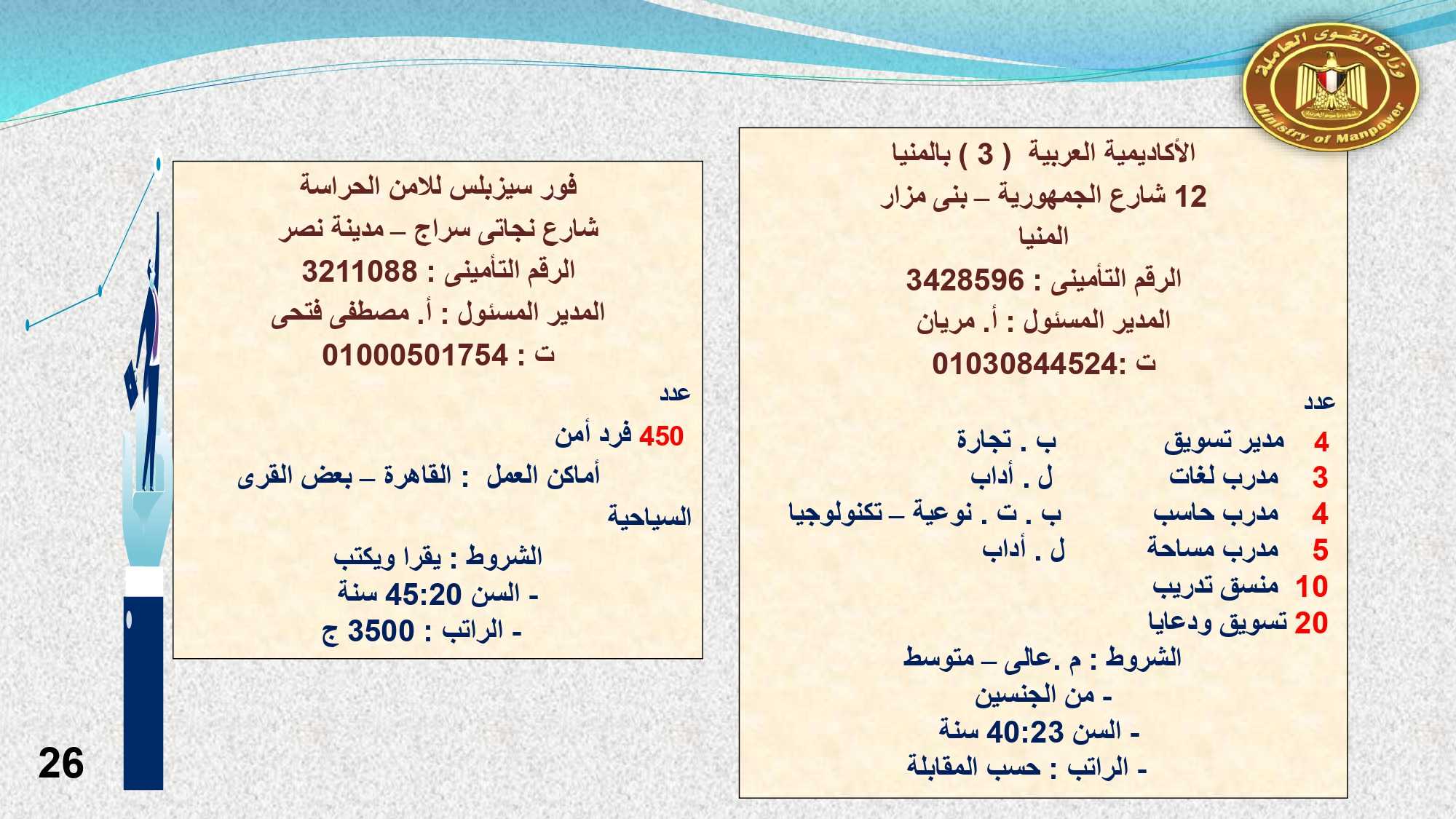 أما فى أسوان وأسيوط الوظائف المتوفرة هى : 13 موظف استقبال وحجز ، و 2 مضيف صالة ، و 4 مراجع ليلى ، و 2 استيور ، و 2 شيف سخن ، و 52 مسئول تأمين ، و 10 مدير غرف ، و2 فنى تمريض .