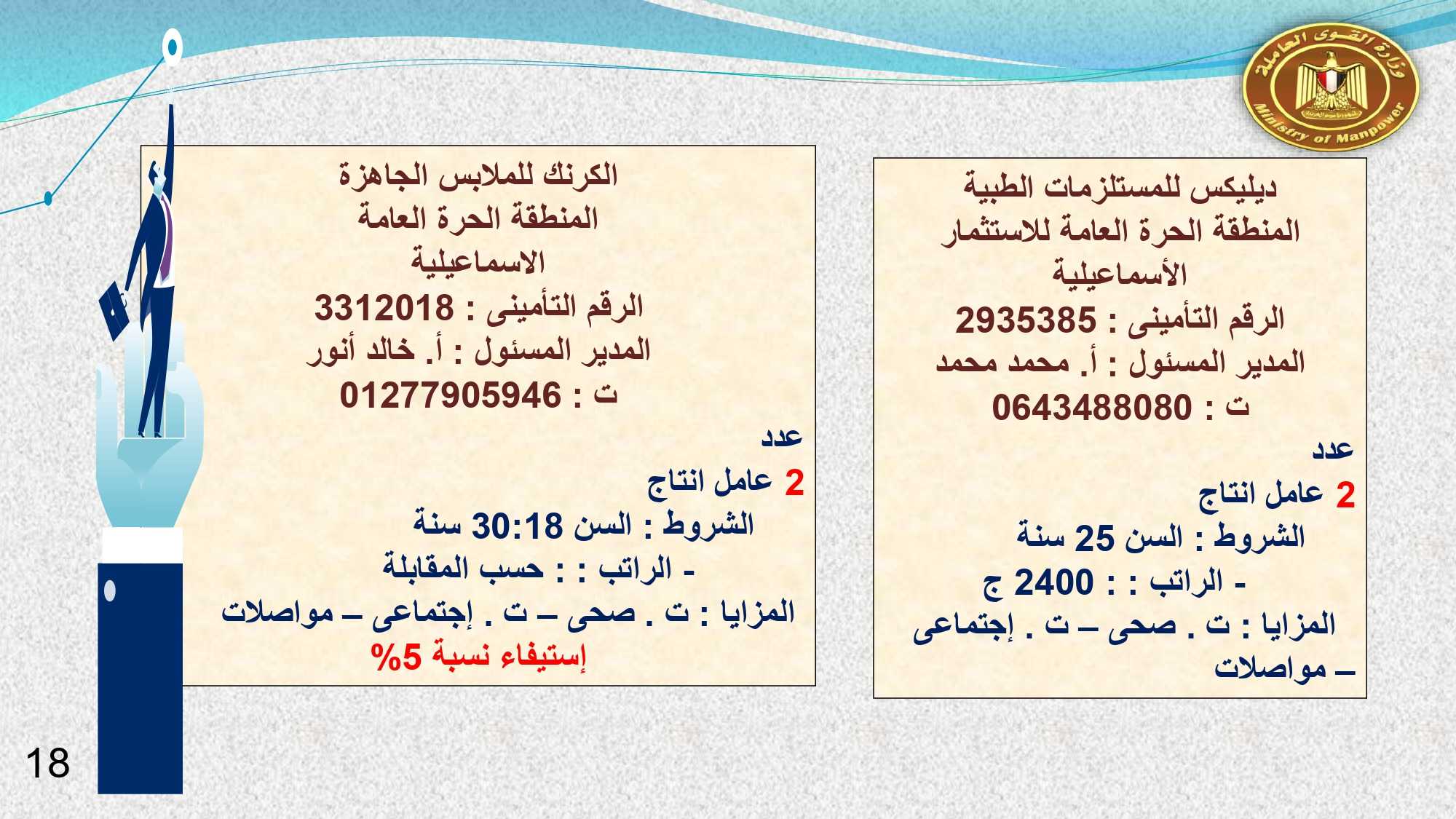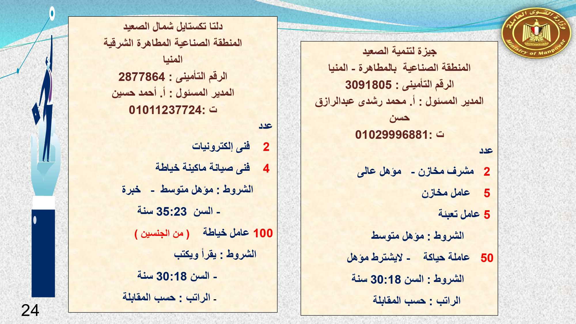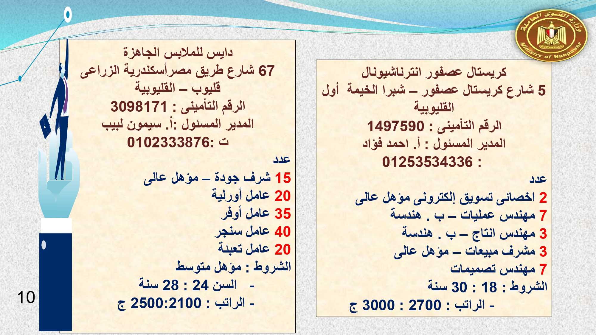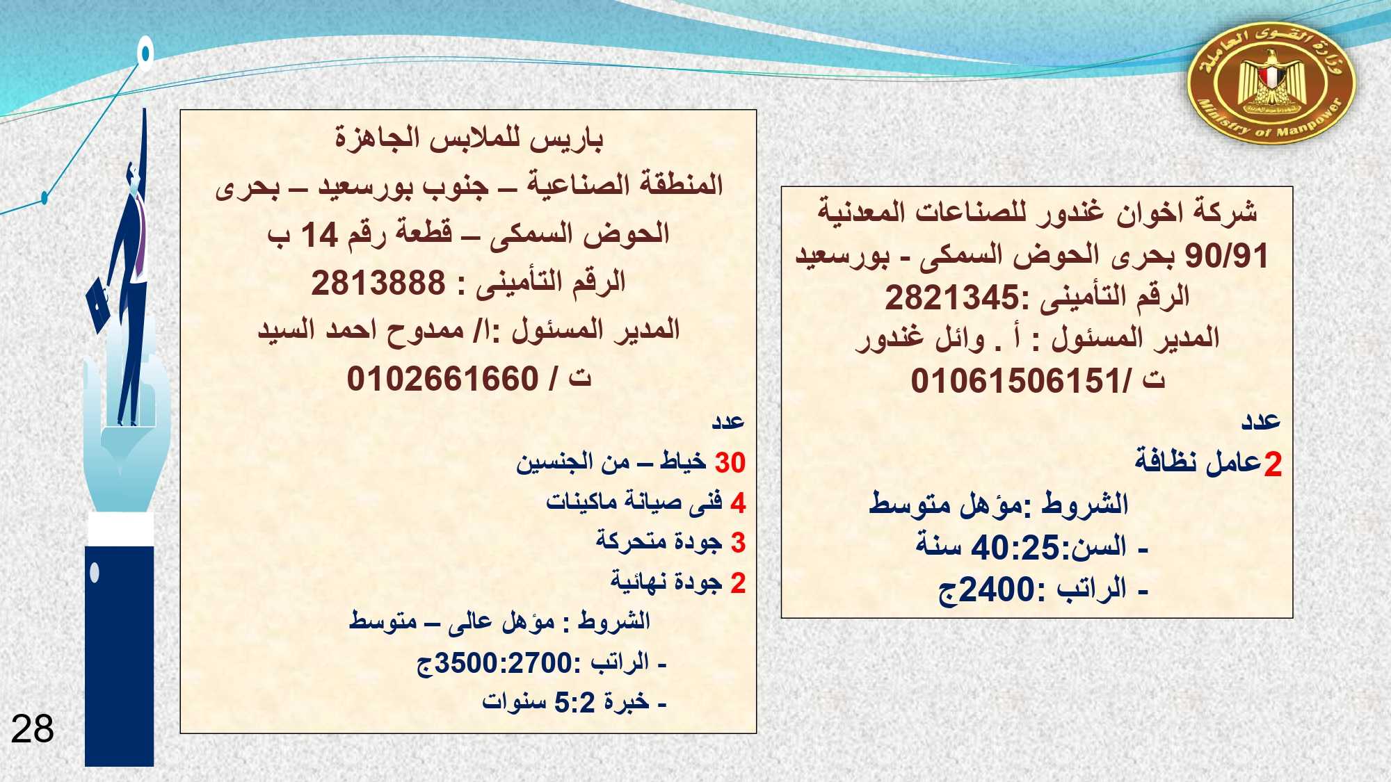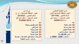 وفى دمياط وبورسعيد : 30 خياط ، و 2 فنى كهرباء ، و 10 عمال انتاج ، و 4 فنى صيانة ميكانيكا، و 3 جودة متحركة، و 2 عامل جودة نهائية، و 2 عامل نظافة .