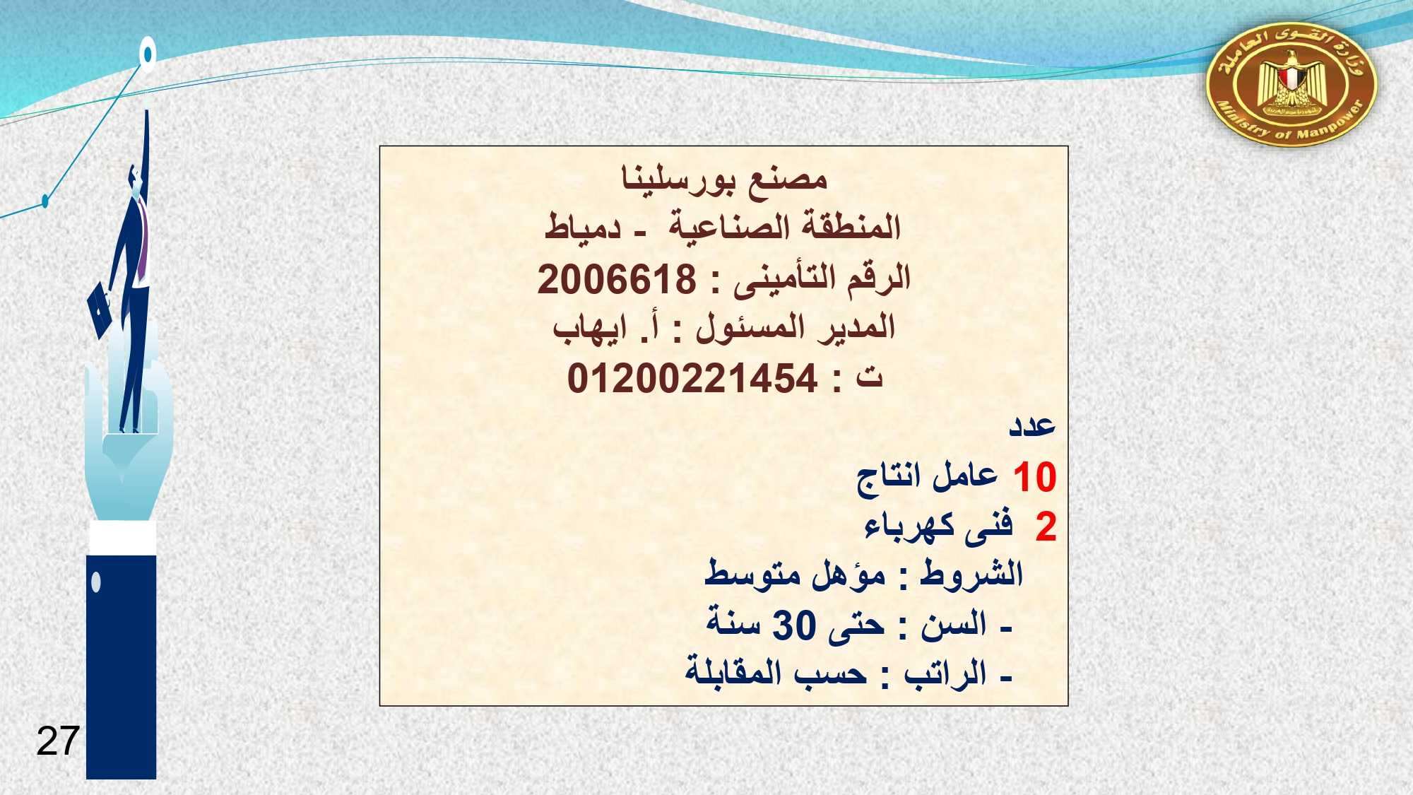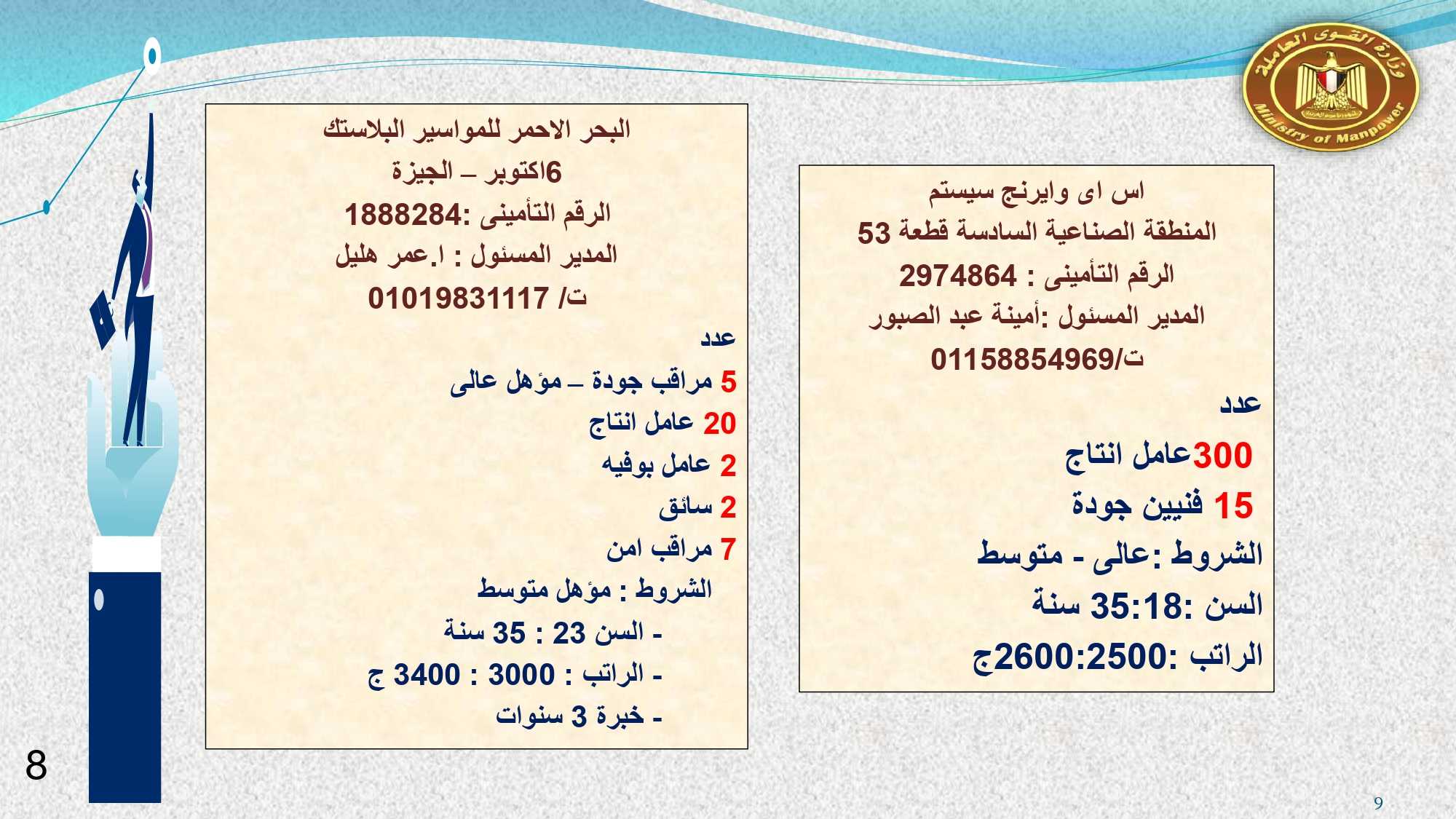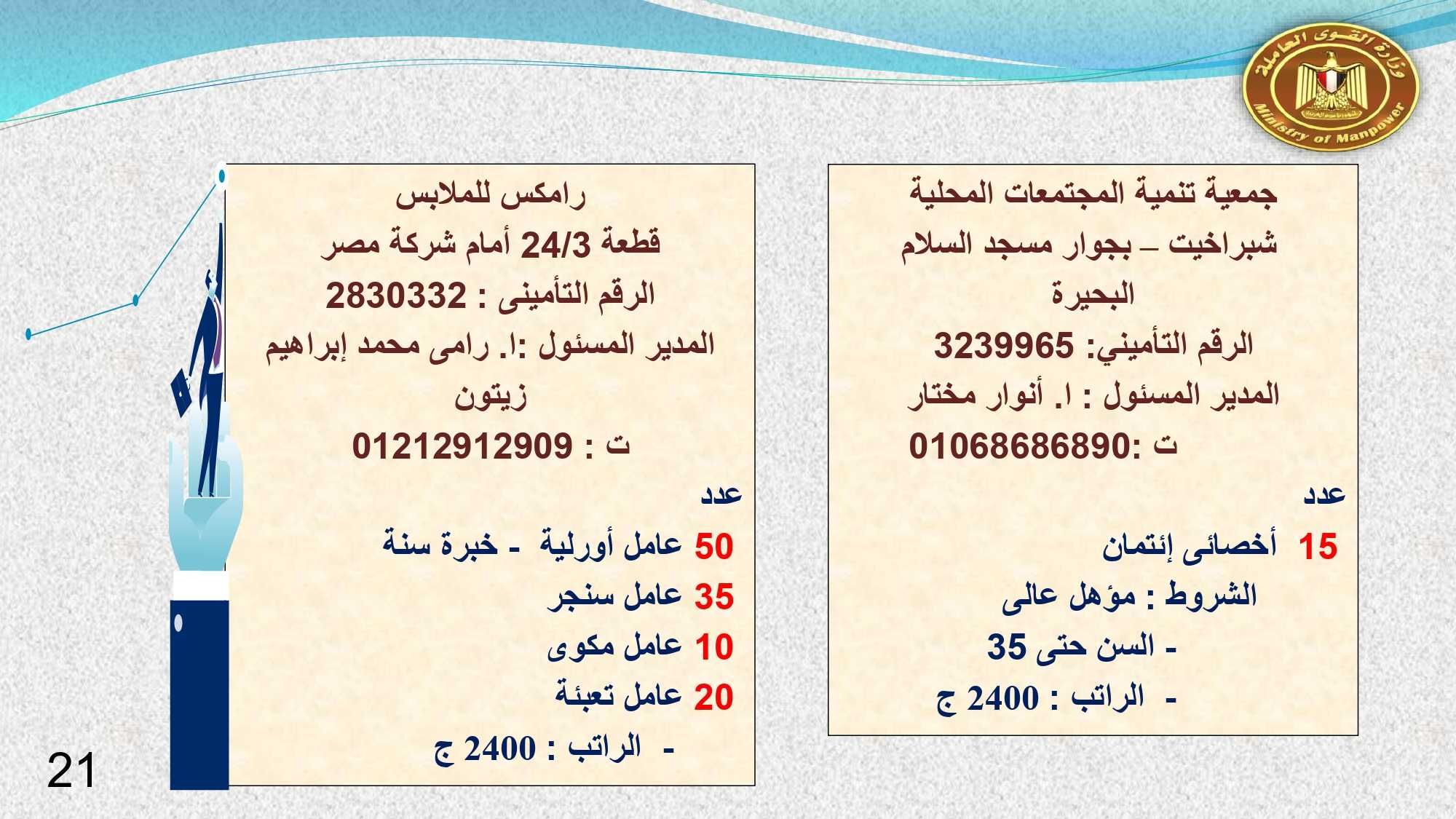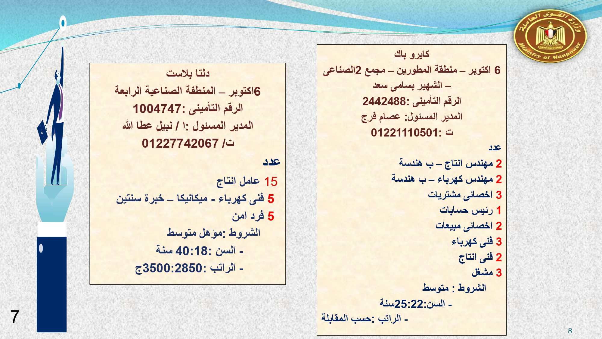 وفى دمياط وبورسعيد : 30 خياط ، و 2 فنى كهرباء ، و 10 عمال انتاج ، و 4 فنى صيانة ميكانيكا، و 3 جودة متحركة، و 2 عامل جودة نهائية، و 2 عامل نظافة .