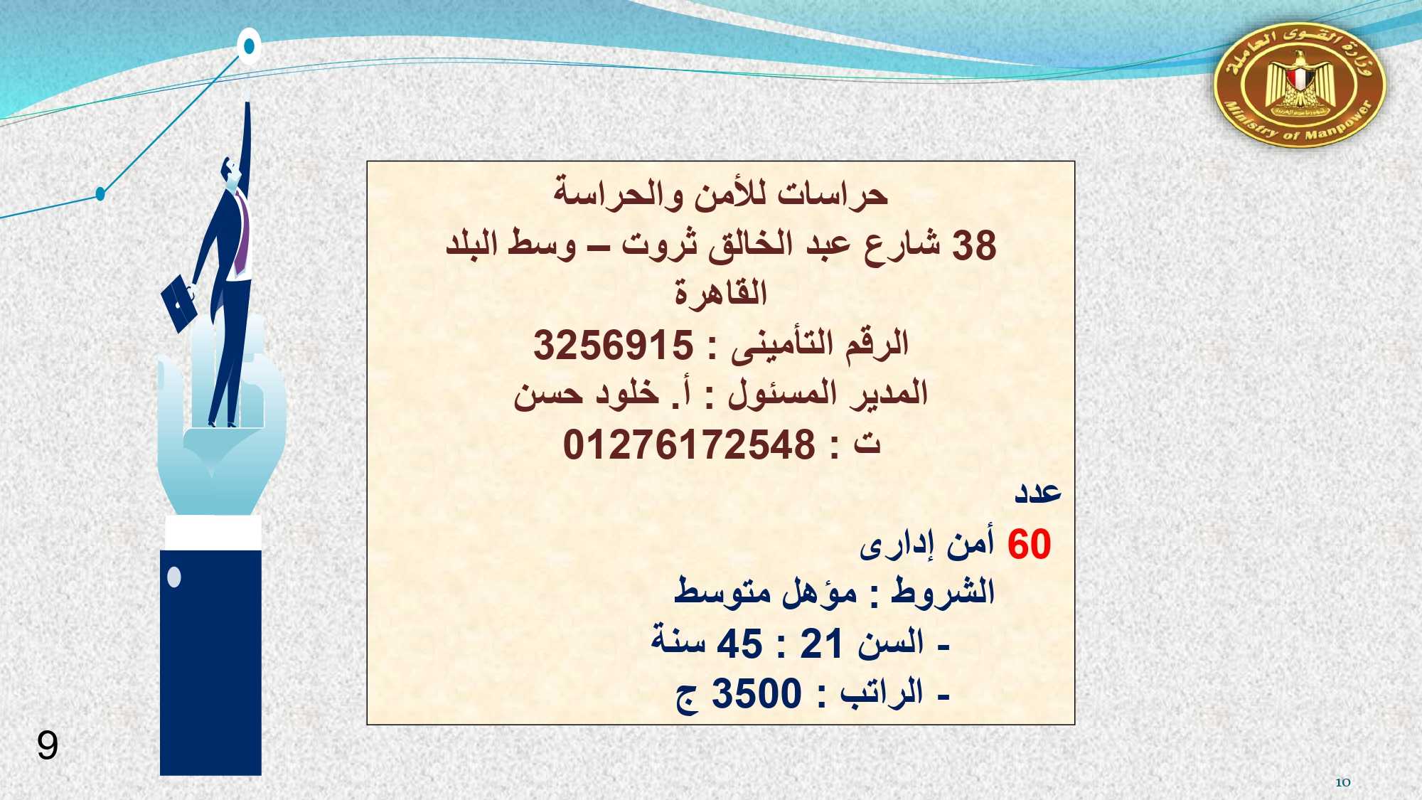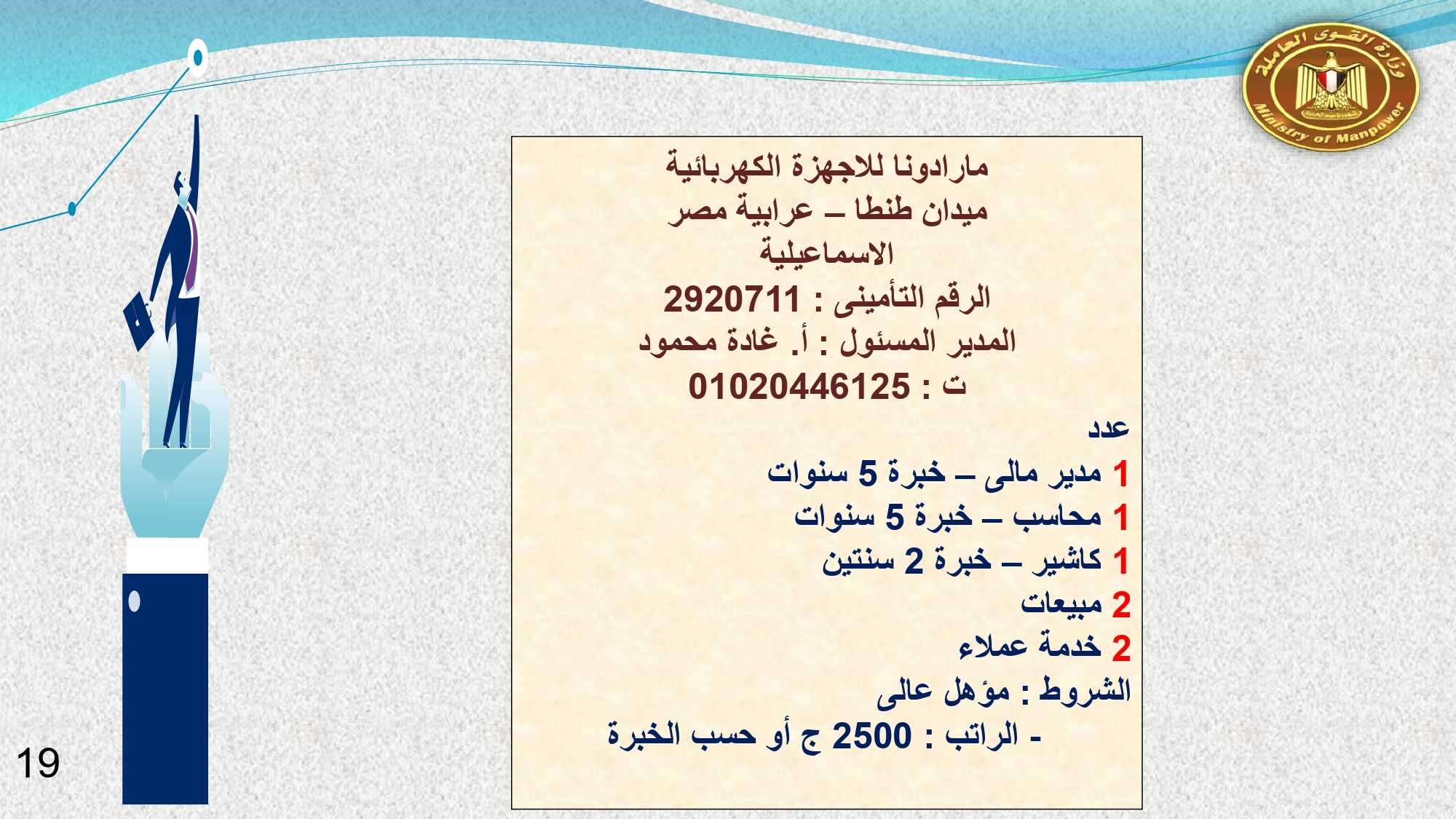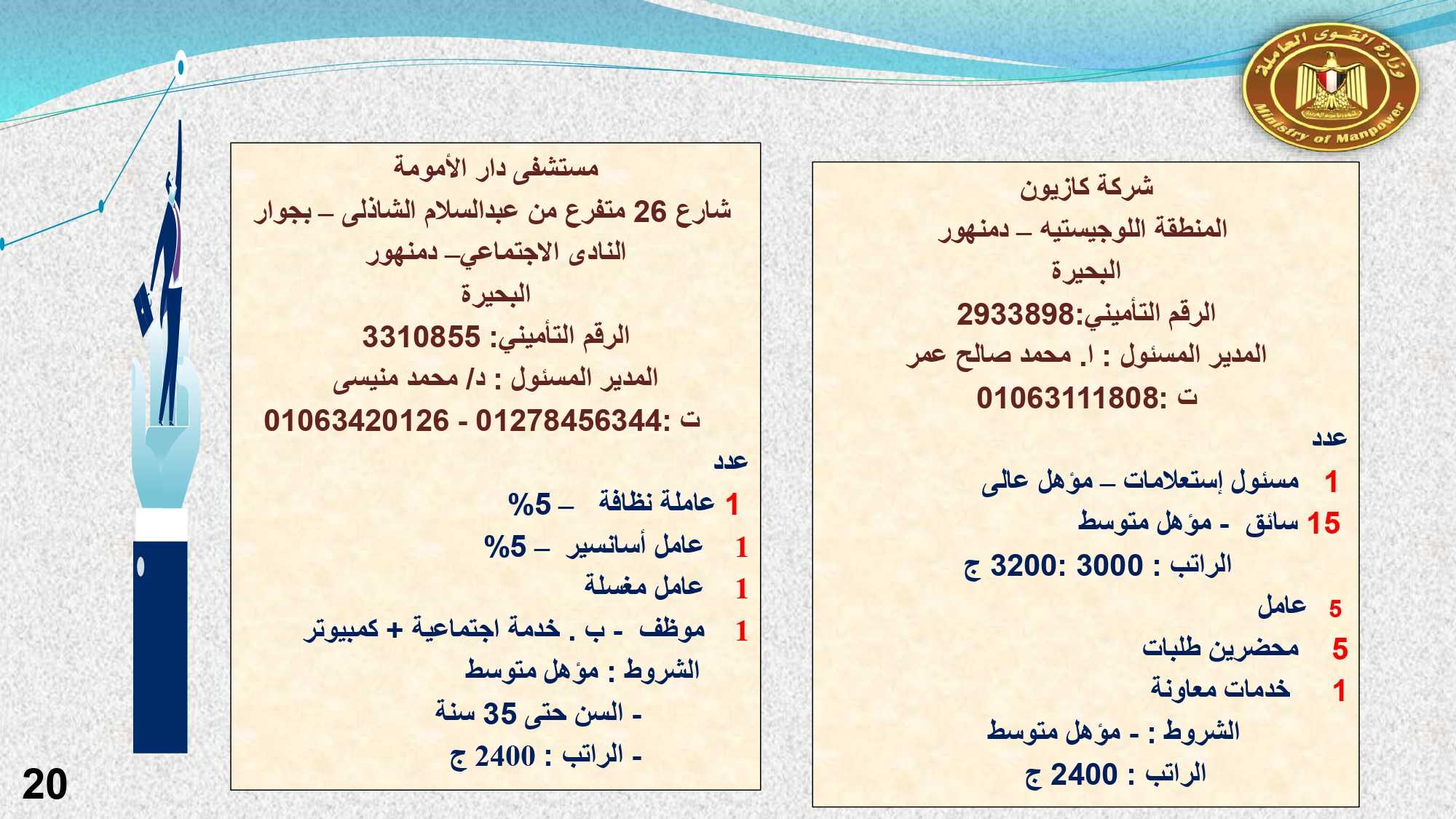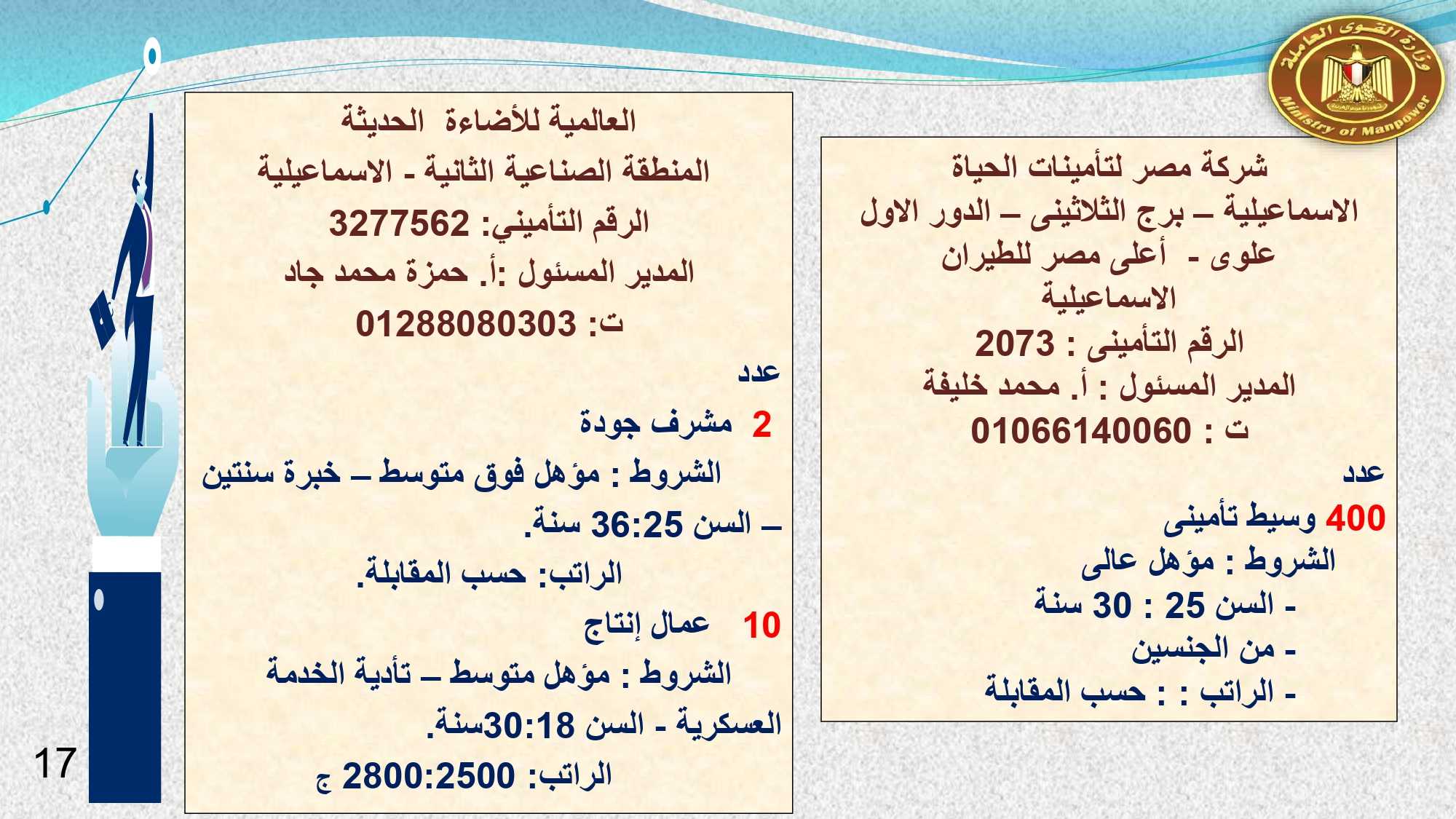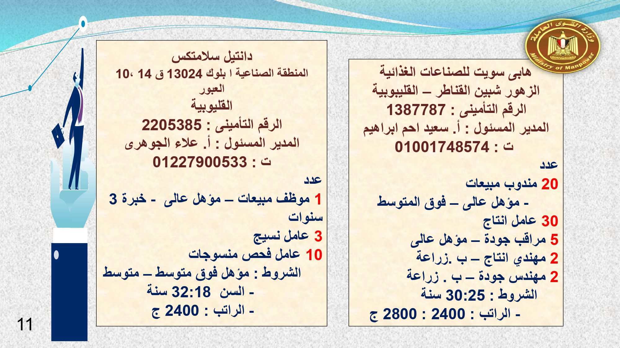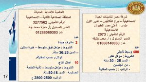 وفى الدقهلية والإسماعيلية مطلوب: مهندس حاسب آلي، و 2 ممرضة، و400 وسيط تأمينى، و 2 مشرف جودة ، ومدير مالي، ومحاسب، و 2 مبيعات ، وكاشير، و 42 عامل إنتاج، و 2 خدمة عملاء ، و 8 عامل نظافة .