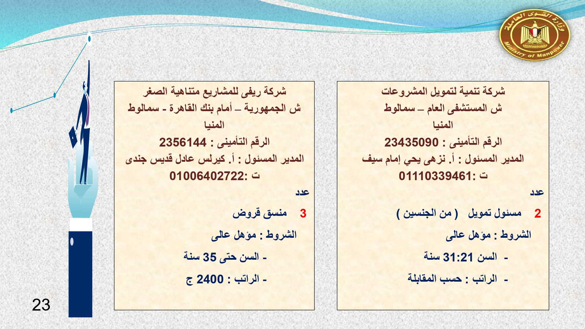 كما تم توفير فرص عمل بالمنيا تمثلت فى : 2 مسئول تمويل ، و 3 منسق قروض ، و7 مشرف مخازن ، و 150 عامل حياكة ، و 2 فنى الكترونيات ، و 24 مسئول تدريب ، و 9 مدير تسويق ، و 3 مدرب لغات ، و 4 مدرب حاسب آلى ، و 450 فرد أمن ، و 42 تسويق ودعاية ، و 4 فنى صيانة ميكانيكا ، و5 عامل تعبئة.