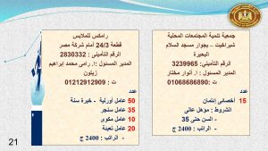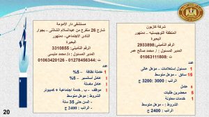 كما وفرت مديرية القوى العاملة بالبحيرة مجموعة من فرص العمل شملت : مسئول إستعلامات ، و موظف كمبيوتر ، و 15 سائق ، و5 محضرين طلبات ، و 15 أخصائى إئتمان ، و 70 عامل اورليه ، و 60 عامل سنجر ، و 17 عامل مكواة ، و20 عامل تعبئة ، و 30 عامل أوفر ، و 2 عامل خدمات معاونة ، و 5 عمال عاديين ، و عامل مغسلة .