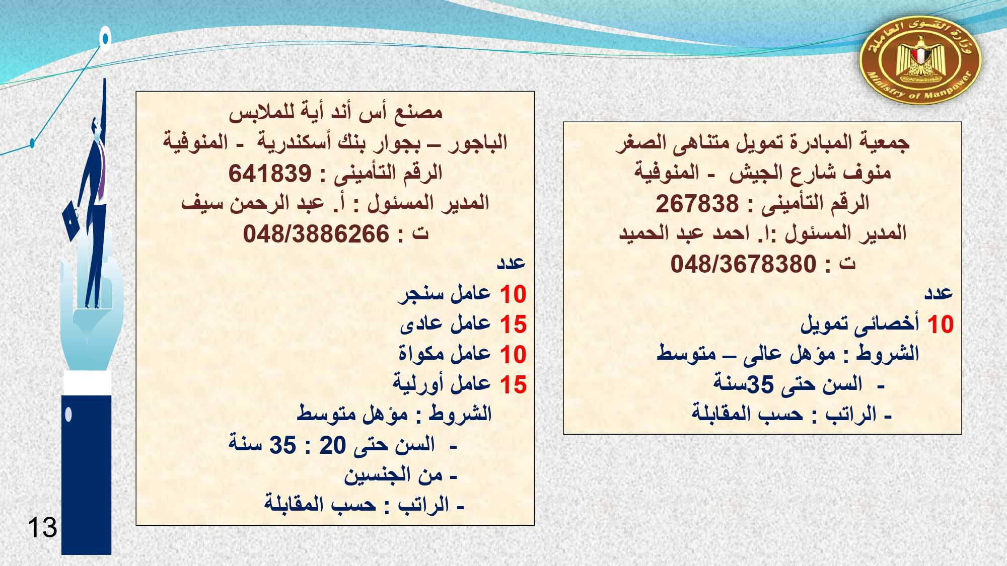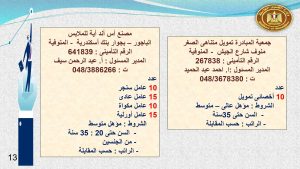 وفى المنوفية مطلوب 10 أخصائى تمويل ، و60 أخصائى خدمات مالية فردى وجماعى ، و 25 منسقة ميدانية ، و 10 عامل سنجر ، و 10 عامل مكواة ، و 10 عامل أورليه ، و15 عامل عادى ، و5 عامل قص ، و عامل خدمات ، وعامل صيانة ، و 3 عمال انتاج ، و 15 عامل تعبئة وتغليف .