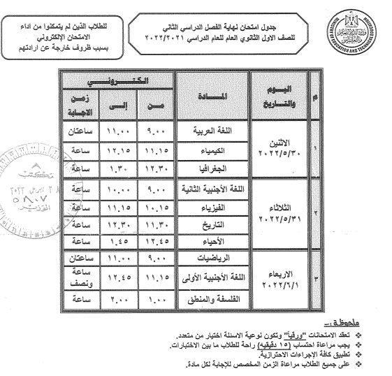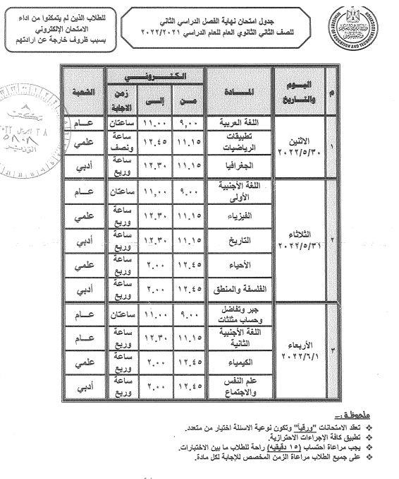 ووفقًا للجدول فأنه سيتم إجراء الامتحان البديل للطلاب الذين لم يتمكنوا من أداء الامتحان الإلكتروني بسبب ظروف خارجة عن إرادتهم على مدار 3 أيام في الفترة من 30 مايو إلى 1 يونيو 2022، على أن تعقد الامتحانات ورقيًا وتكون نوعية الأسئلة اختيار من متعدد.