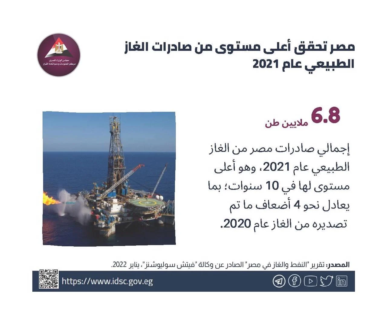 وأوضح الانفوجراف أنه وفقًا لتقرير “النفط والغاز في مصر” الصادر عن وكالة “فيتش سوليوشنز” في يناير 2022، أنه بلغ إجمالي صادرات مصر من الغاز الطبيعي نحو 6.8 ملايين طن عام 2021.