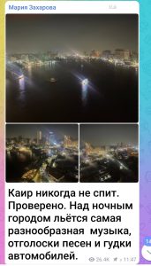 وعلقت زاخاروفا على الصور التي نشرتها على قناتها في “تيليغرام”: “القاهرة التي لا تنام أبدا، خلال الليل في المدينة تنساب الموسيقى وتصدح الأغاني المختلفة وتُسمع أبواق السيارات”.