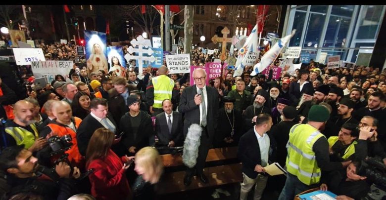 تظاهر آلاف من ابناء الكنائس والجاليات بولاية نيو ساوث ويلز والطوائف فى ميدان مارتن بلاس وسط مدينة سيدنى يتقدمهم القيادات الكنسية بكافة طوائفها أعتراضًا على قانون الاجهاض الجديد الذى ينص على تجريم أغتيال الأجنحة حتى ساعات قليلة من ولادتهم.