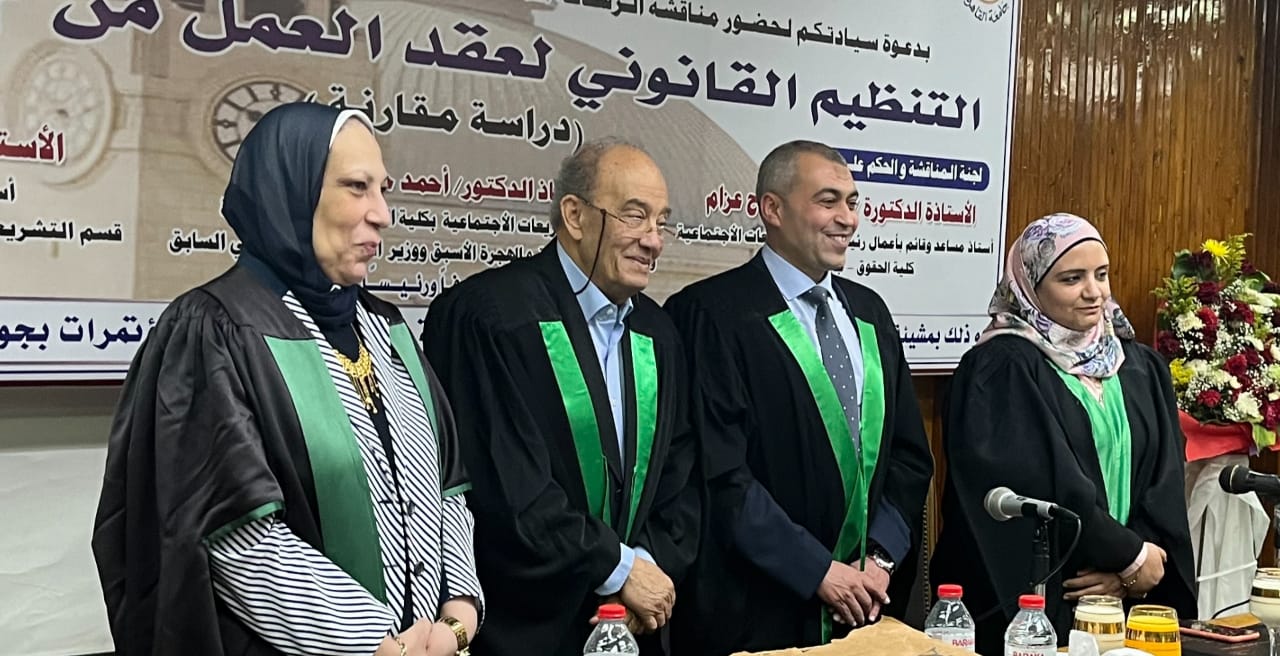 وتكونت لجنة المناقشة والحكم من الدكتور أحمد حسن البرعى استاذ التشريعات الاجتماعية بكلية الحقوق جامعة القاهرة ووزير القوى العاملة والهجرة الأسبق ووزير التضامن الاجتماعى السابق مشرفا ورئيسًا ، والدكتورة رندا محمد صميدة استاذ مساعد وقائم بأعمال رئيس قسم التشريعات الاجتماعية بكلية الحقوق جامعة القاهرة عضوا والدكتورة علا فاروق صلاح عزام القائم بعمل رئيس قسم التشريعات الاجتماعية بكلية الحقوق جامعة حلوان .